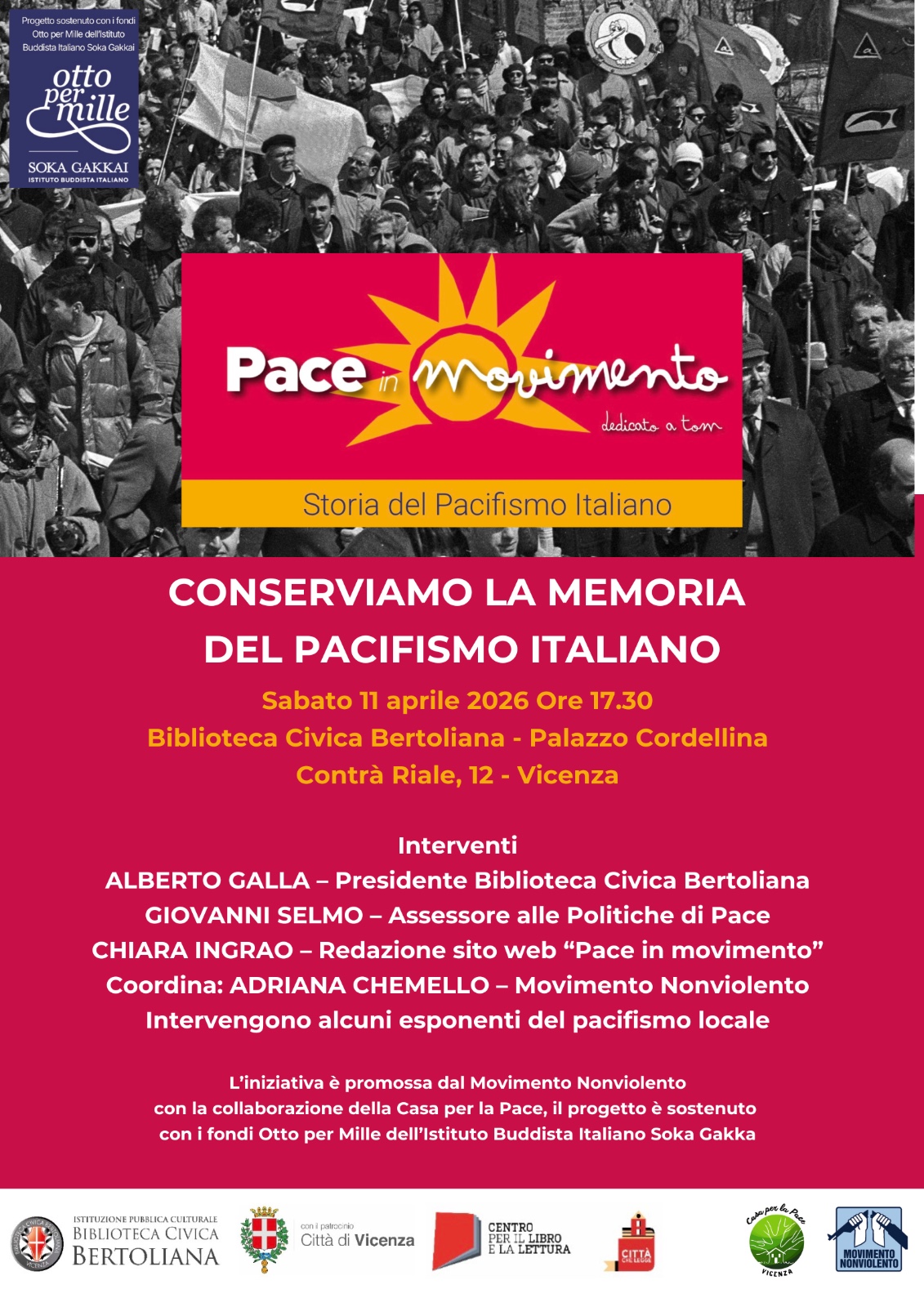 La Biblioteca civica Bertoliana di Vicenza ospita a Palazzo Cordellina (contra’ Riale 12), sabato 11 aprile alle 17.30, l'incontro pubblico "Conserviamo la memoria del pacifismo italiano", dedicato alla presentazione del sito web nazionale www.paceinmovimento.it.