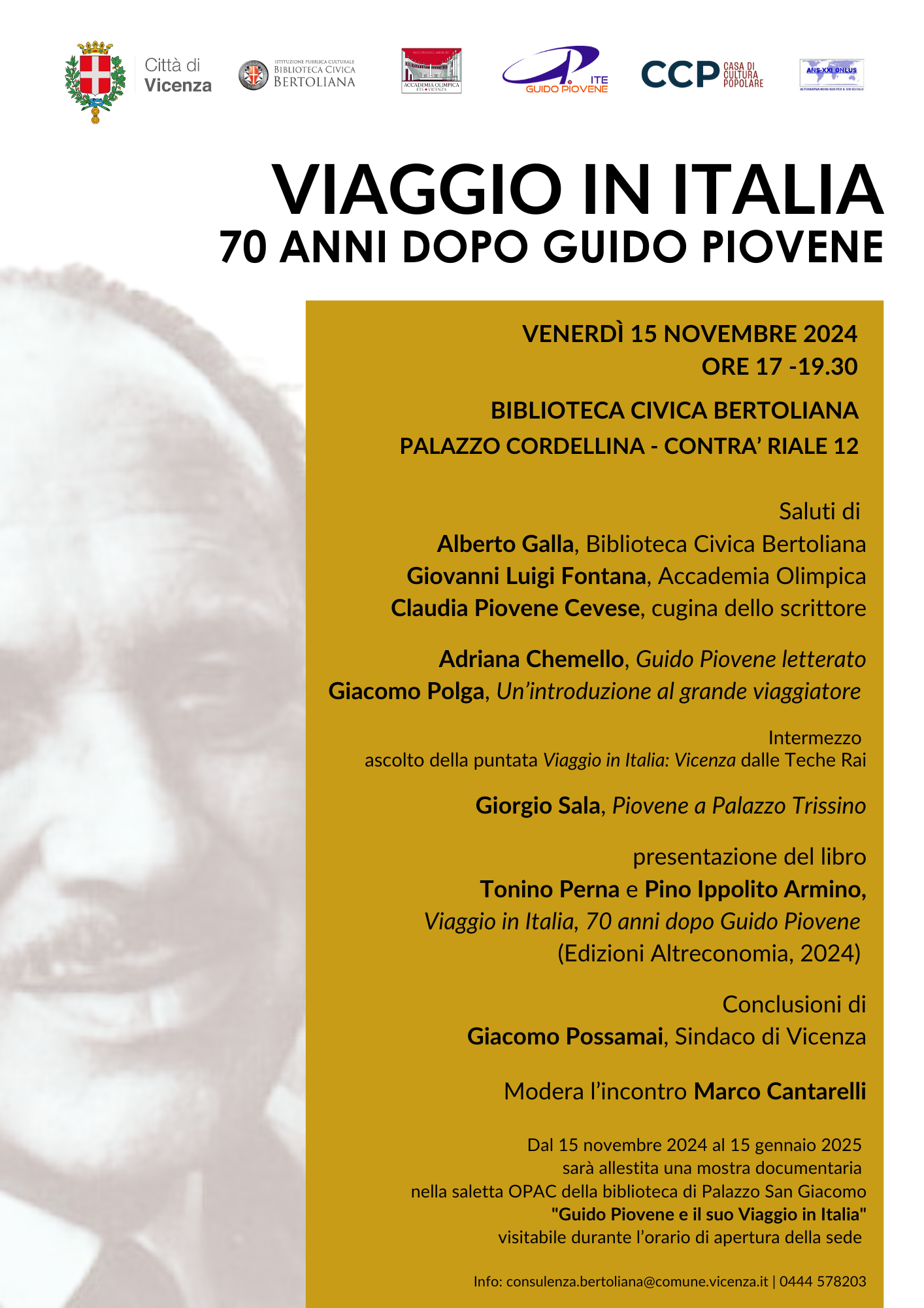 La città ricorderà lo scrittore anche con altre iniziative. Il mattino di venerdì 15 novembre gli autori Perna e Ippolito Armino, con la partecipazione di Cantarelli, saranno ospiti dell’Istituto tecnico economico di Vicenza intitolato proprio a Guido Piovene nel corso di un incontro con le classi quarte e quinte dell’indirizzo turistico. Sono previsti interventi di alcuni studenti sul tema dei viaggi, l’analisi dei “Viaggi in Italia” di Goethe, Piovene e Perna con Ippolito Armino, con focus sul turismo. Una mostra documentaria allestita dalla Bertoliana con i materiali dell’archivio, dedicata a “Guido Piovene e il suo viaggio in Italia”, sarà liberamente visitabile nella saletta Opac della sede di Palazzo San Giacomo (contra’ Riale 5) dal 15 novembre al 15 gennaio negli orari di apertura. Infine lunedì 2 dicembre alle 18 nella sala manoscritti della stessa sede è organizzato invece un reading teatrale con Stefania Carlesso e Marco Cavalli.