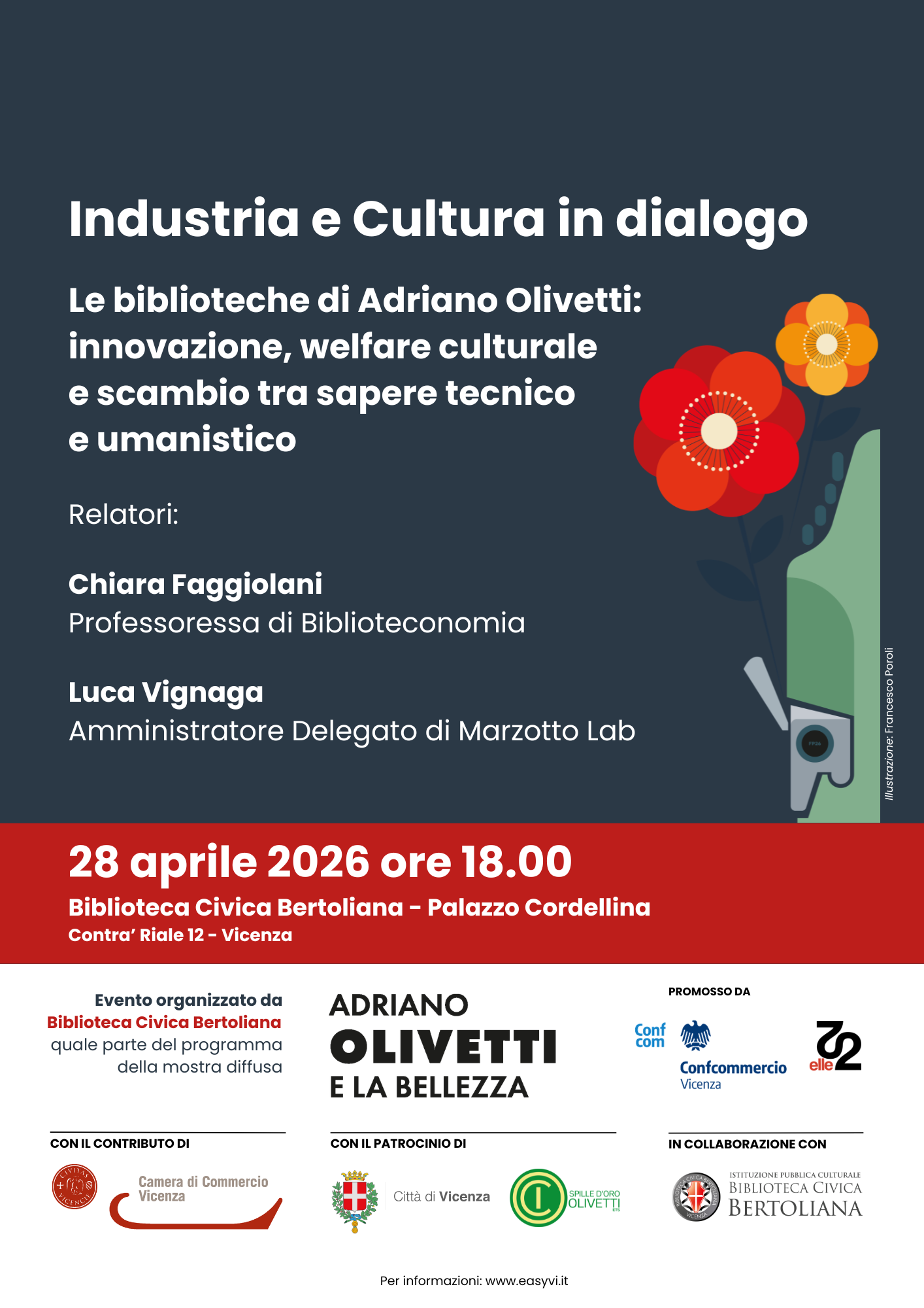L’evento si inserisce nel calendario di iniziative della mostra diffusa “Adriano Olivetti e la bellezza”, aperta dall’1 aprile al 10 maggio 2026, promossa da Confcommercio Vicenza e dall’associazione Elle22 con il patrocinio del Comune di Vicenza e la collaborazione della Biblioteca civica Bertoliana.