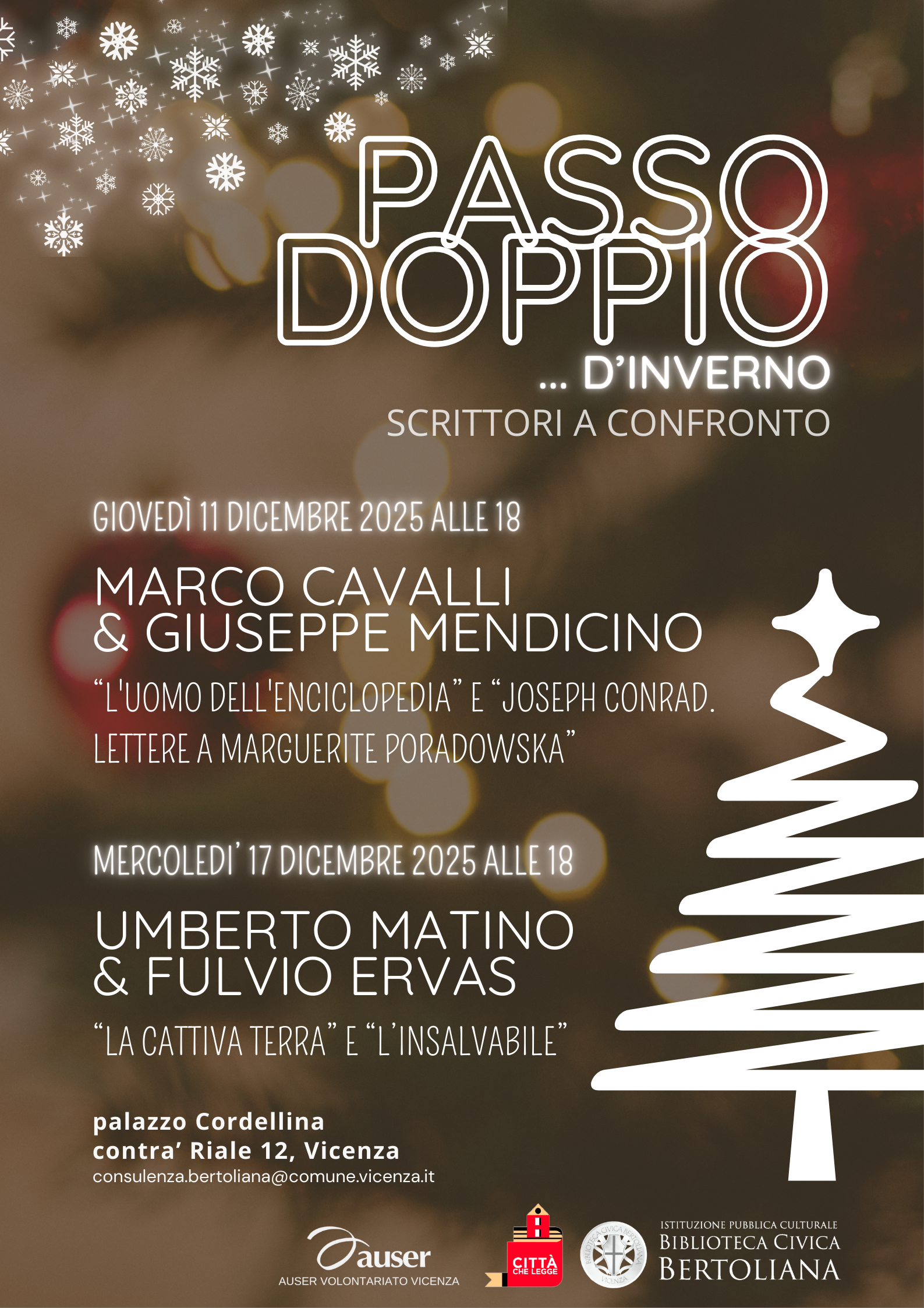 Torna in Bertoliana “Passo doppio. Scrittori a confronto”, ma in versione invernale. Dopo il successo ottenuto quest’estate nell’ambito della rassegna culturale “Cortili aperti”, palazzo Cordellina ripropone la fortunata formula in cui due autori incontrano il pubblico presentando ciascuno un libro dell’altro. Gli appuntamenti in calendario sono due, entrambi alle 18 in sala Dalla Pozza a palazzo Cordellina (contra’ Riale 12).