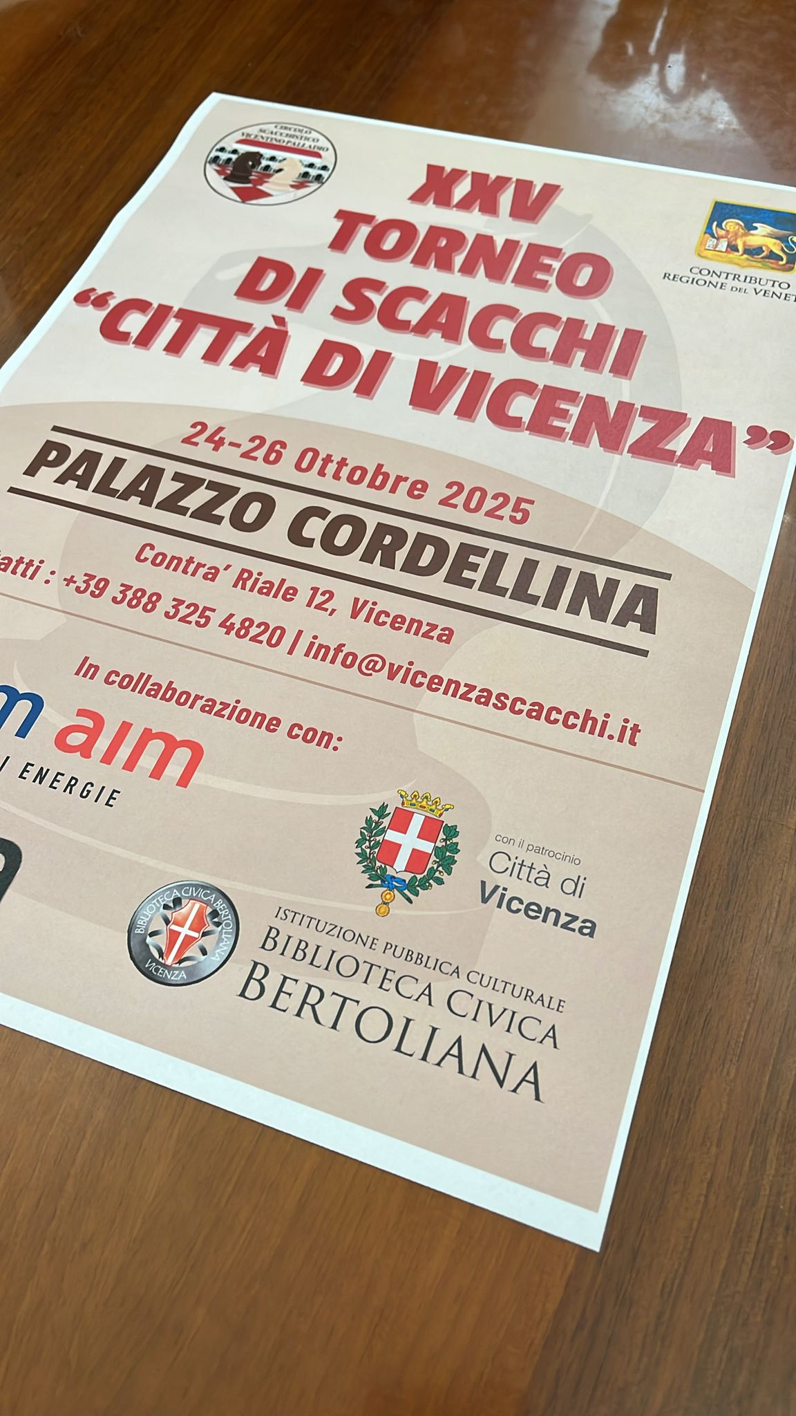 Torna a Vicenza il grande appuntamento con il torneo internazionale di scacchi “Città di Vicenza”, che nel 2025 festeggerà la sua 25ª edizione. Dopo il successo con il tutto esaurito dello scorso anno, la manifestazione internazionale si svolgerà da venerdì 24 a domenica 26 ottobre 2025. Ancora pochi i posti disponibili.