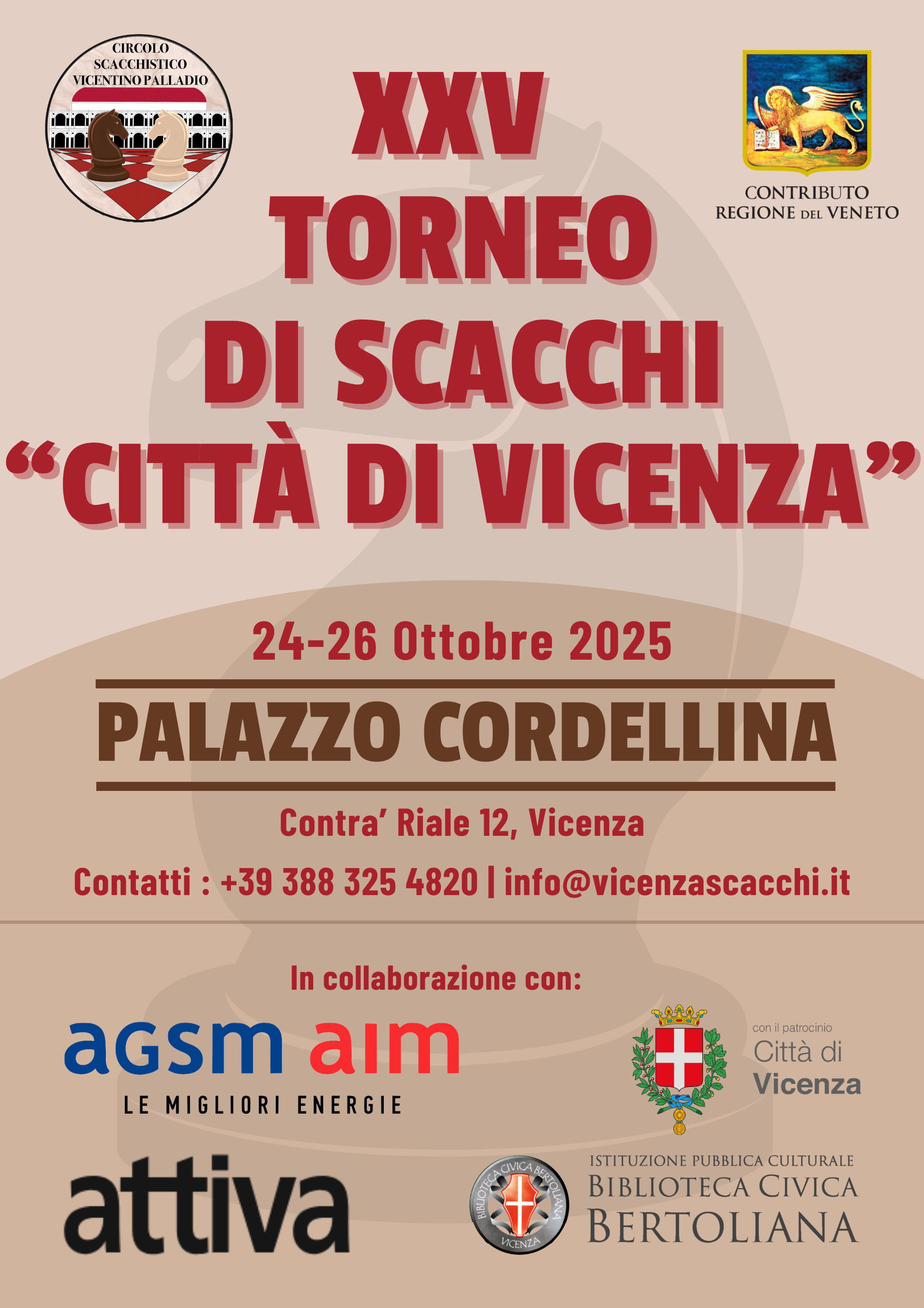 Il torneo internazionale “Città di Vicenza”, organizzato dal Circolo Scacchistico Vicentino Palladio con il patrocinio del Comune di Vicenza e la collaborazione della Biblioteca Bertoliana, prevede tre giorni di sfide, momenti di divulgazione e attività per il pubblico.