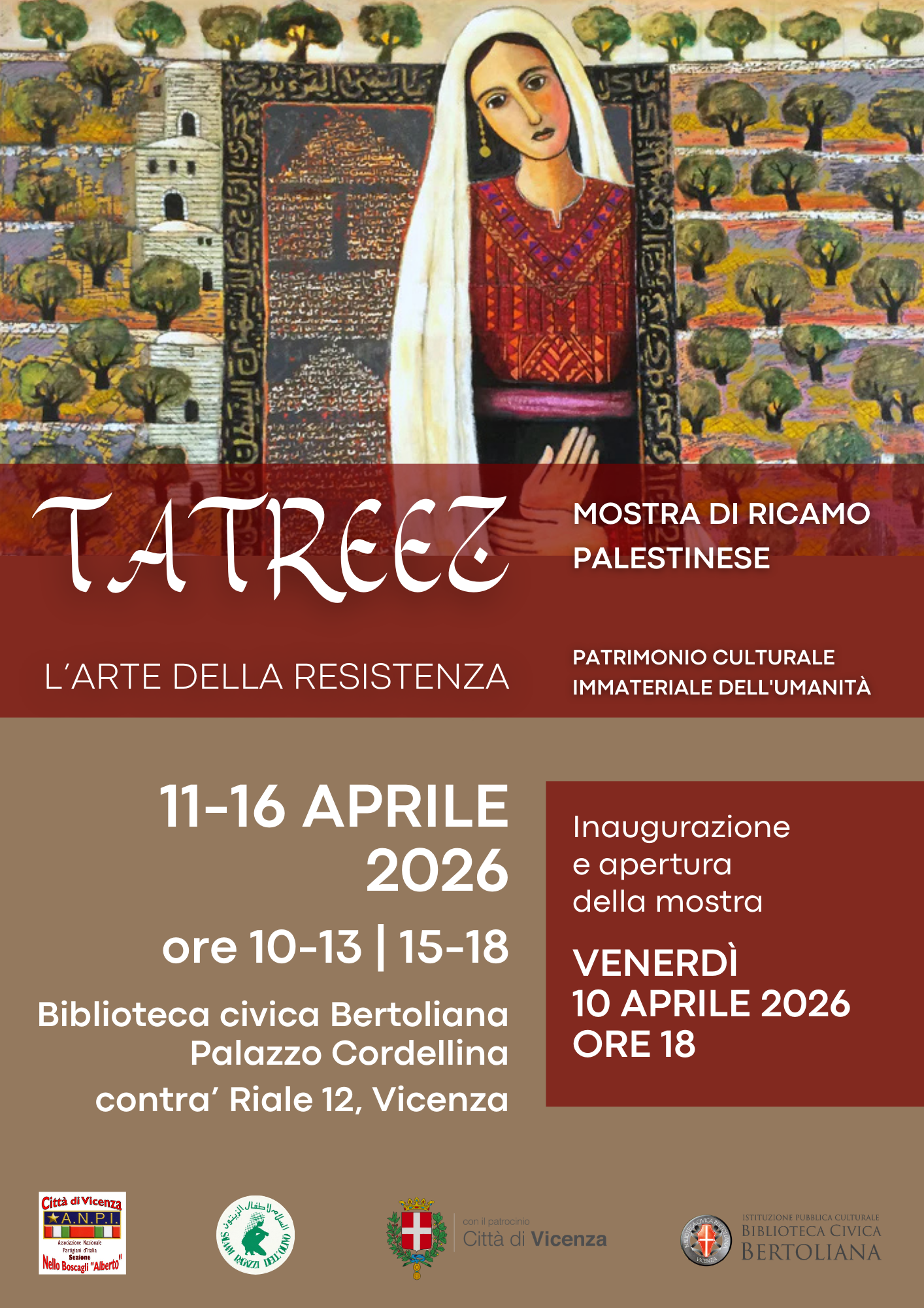 La Biblioteca civica Bertoliana, in collaborazione con la sezione ANPI di Vicenza e Salaam Ragazzi dell’Olivo, e con il patrocinio del Comune di Vicenza, ospiterà al piano nobile di Palazzo Cordellina (contra’ Riale 12 ) la mostra dedicata all’antica arte del ricamo palestinese.
