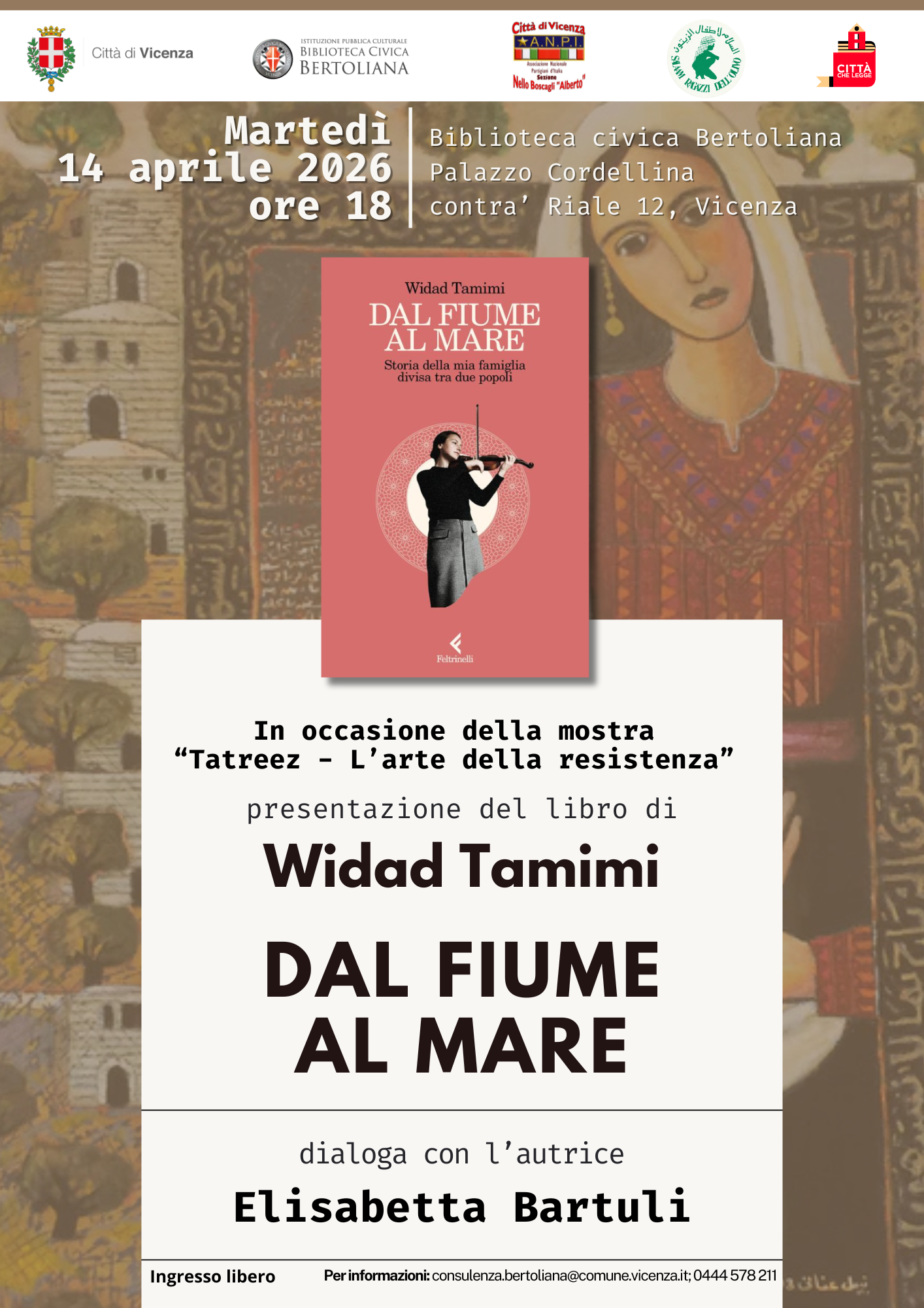Il percorso espositivo, visitabile da sabato 11 a giovedì 16 aprile dalle 10 alle 13 e dalle 15 alle 18, sarà arricchito da un momento di approfondimento letterario: martedì 14 aprile alle 18, nella Sala Dalla Pozza di Palazzo Cordellina, la scrittrice Widad Tamimi presenterà il suo ultimo libro "Dal fiume al mare" (Feltrinelli), una storia di dolore, radici e speranza, in cui l’autrice intreccia memoria personale e riflessione civile, accompagnando il lettore nel cuore vivo del conflitto israelo-palestinese.