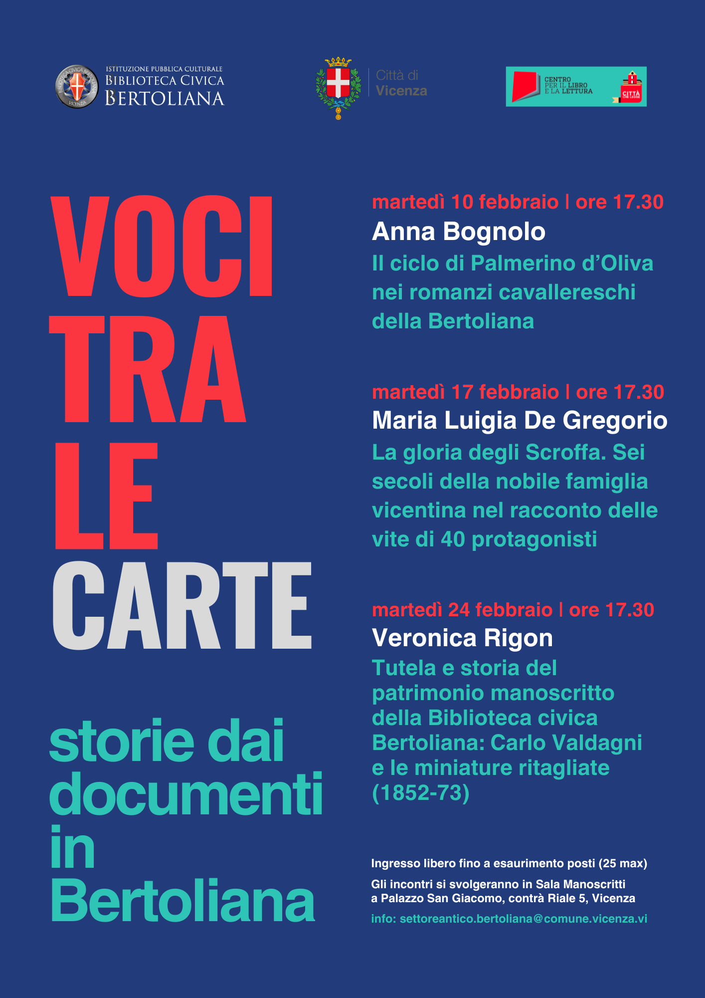 Martedì 10 febbraio 2026, alle ore 17.30, nella Sala Manoscritti di Palazzo San Giacomo, la Biblioteca civica Bertoliana propone la conferenza Il ciclo di Palmerino d’Oliva nei romanzi cavallereschi italiani con Anna Bognolo, nell’ambito del progetto “Voci tra le carte”. Ingresso libero.