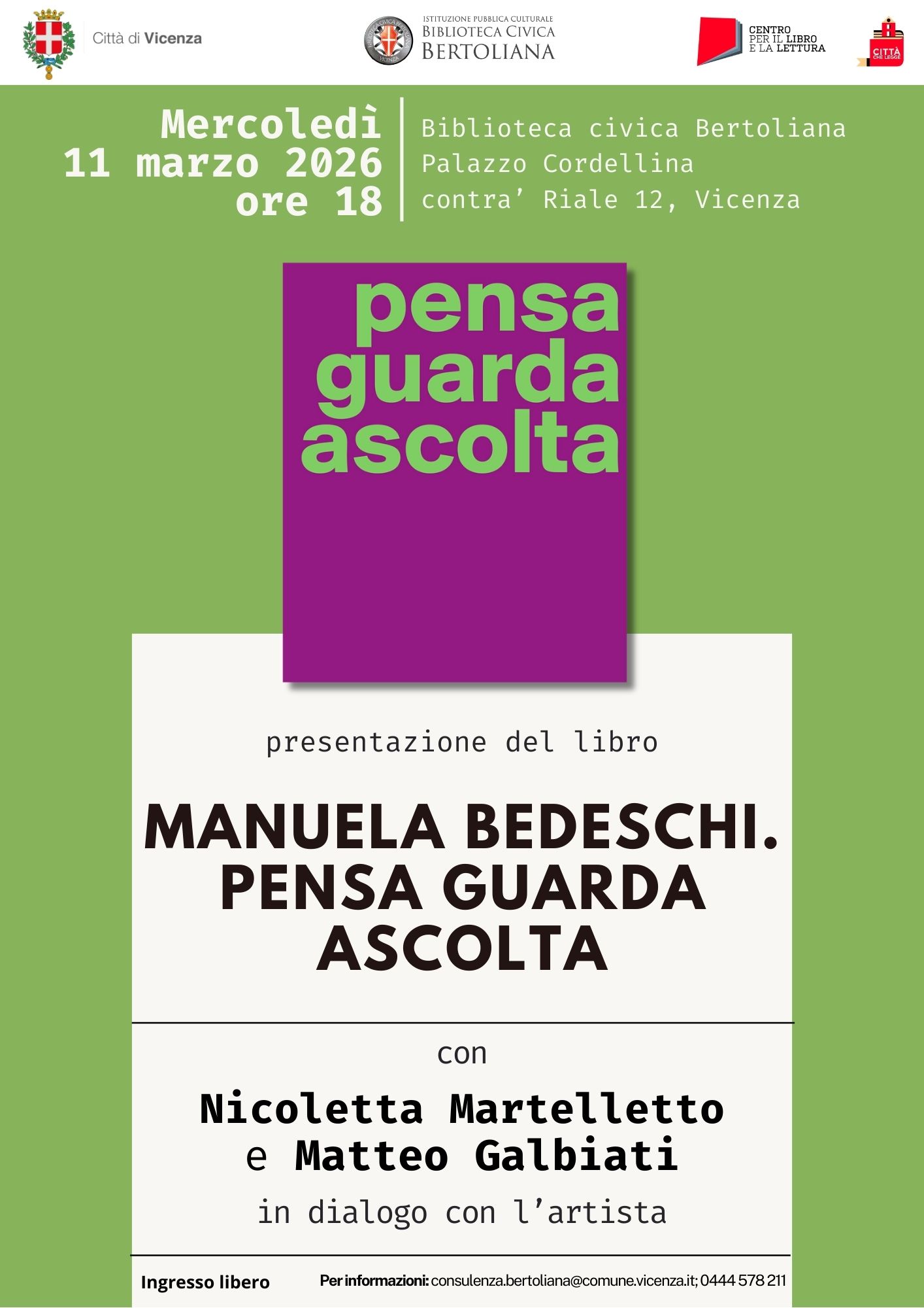 Mercoledì 11 marzo alle ore 18:00, a Palazzo Cordellina (contra' Riale 12), si terrà la presentazione del libro "Pensa guarda ascolta" di Manuela Bedeschi, un evento a cura della Biblioteca Civica Bertoliana.
