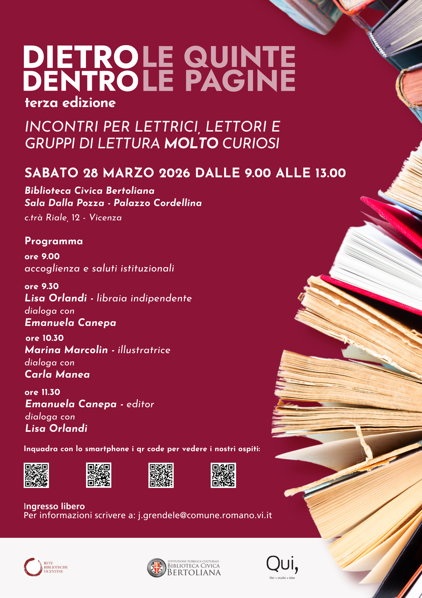 Sabato 28 marzo, la Biblioteca Civica Bertoliana invita il pubblico a un evento speciale presso la Sala Dalla Pozza di Palazzo Cordellina. Dalle ore 9:00 alle 13:00, si terrà l'incontro "Dietro le quinte, dietro le pagine", un’iniziativa pensata per coinvolgere lettrici, lettori e gruppi di lettura in un percorso di approfondimento e scoperta.