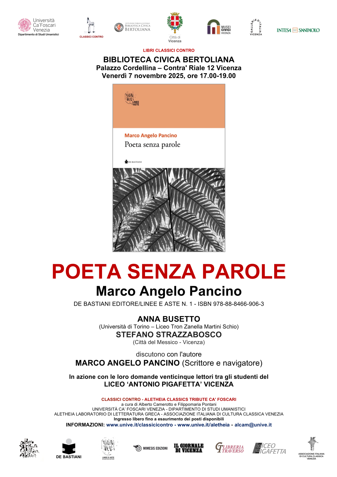 La Biblioteca Civica Bertoliana di Vicenza ospita, nella suggestiva cornice di Palazzo Cordellina (Contrà Riale 12), un nuovo appuntamento del ciclo Libri Classici Contro: la presentazione di Poeta senza parole di Marco Angelo Pancino (De Bastiani Editore).