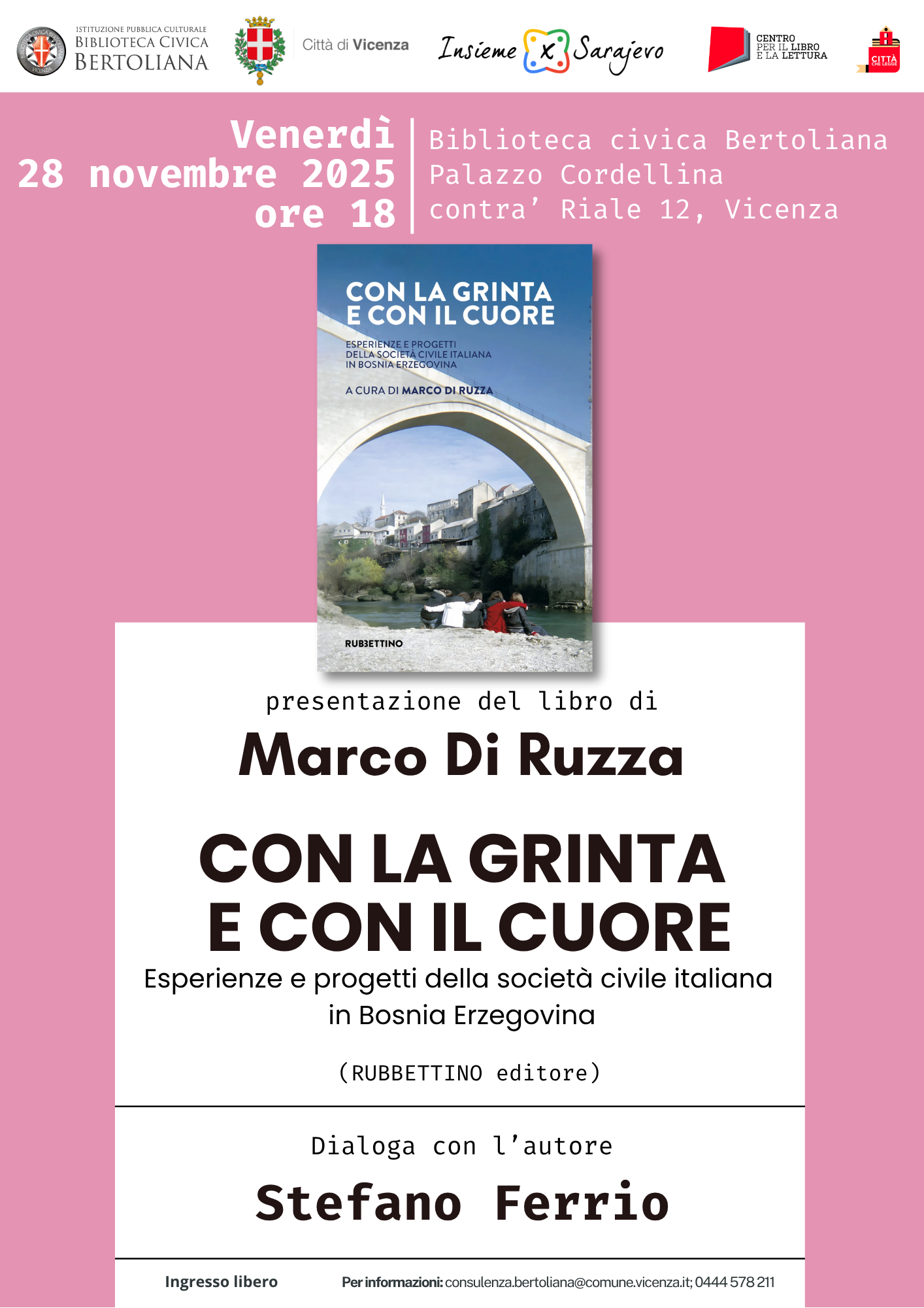 Venerdì 28 novembre 2025, alle ore 18, presso Palazzo Cordellina – Biblioteca Civica Bertoliana (contra’ Riale 12, Vicenza), si terrà la presentazione del volume di Marco Di Ruzza Con la grinta e con il cuore. Esperienze e progetti della società civile italiana in Bosnia Erzegovina, edito da Rubbettino.