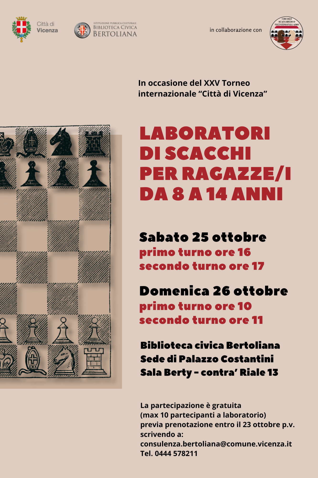 In occasione della 25esima edizione del torneo internazionale di scacchi “Città di Vicenza”, che si terrà dal 24 al 26 ottobre a palazzo Cordellina, sede di rappresentanza della Biblioteca civica Bertoliana, vengono organizzati dei laboratori gratuiti per bambini e bambine, ragazzi e ragazze della fascia d’età dagli 8 ai 14 anni.