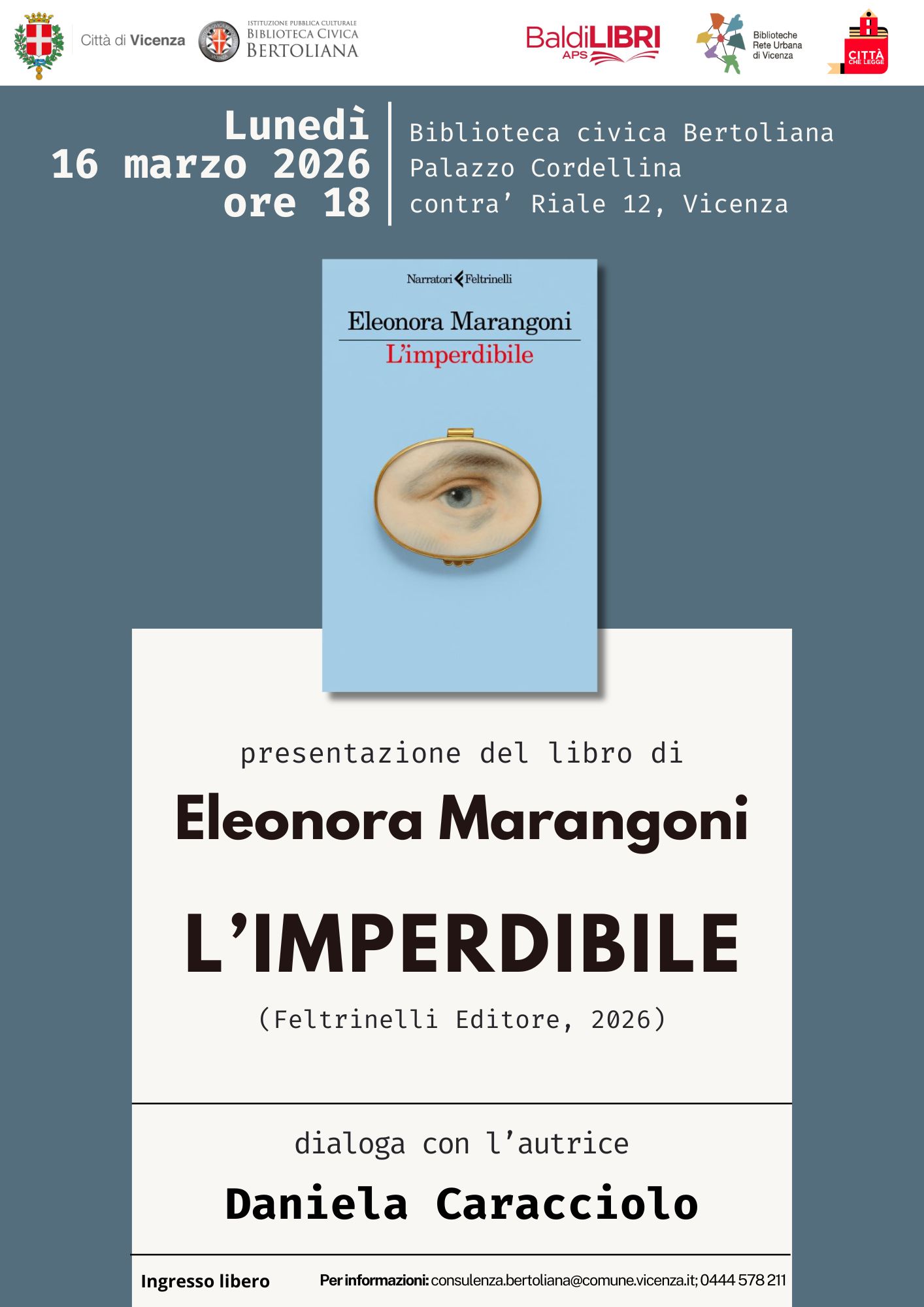 Lunedì 16 marzo alle ore 18:00, presso Palazzo Cordellina, la Biblioteca Civica Bertoliana invita alla presentazione del libro "L'imperdibile" di Eleonora Marangoni.