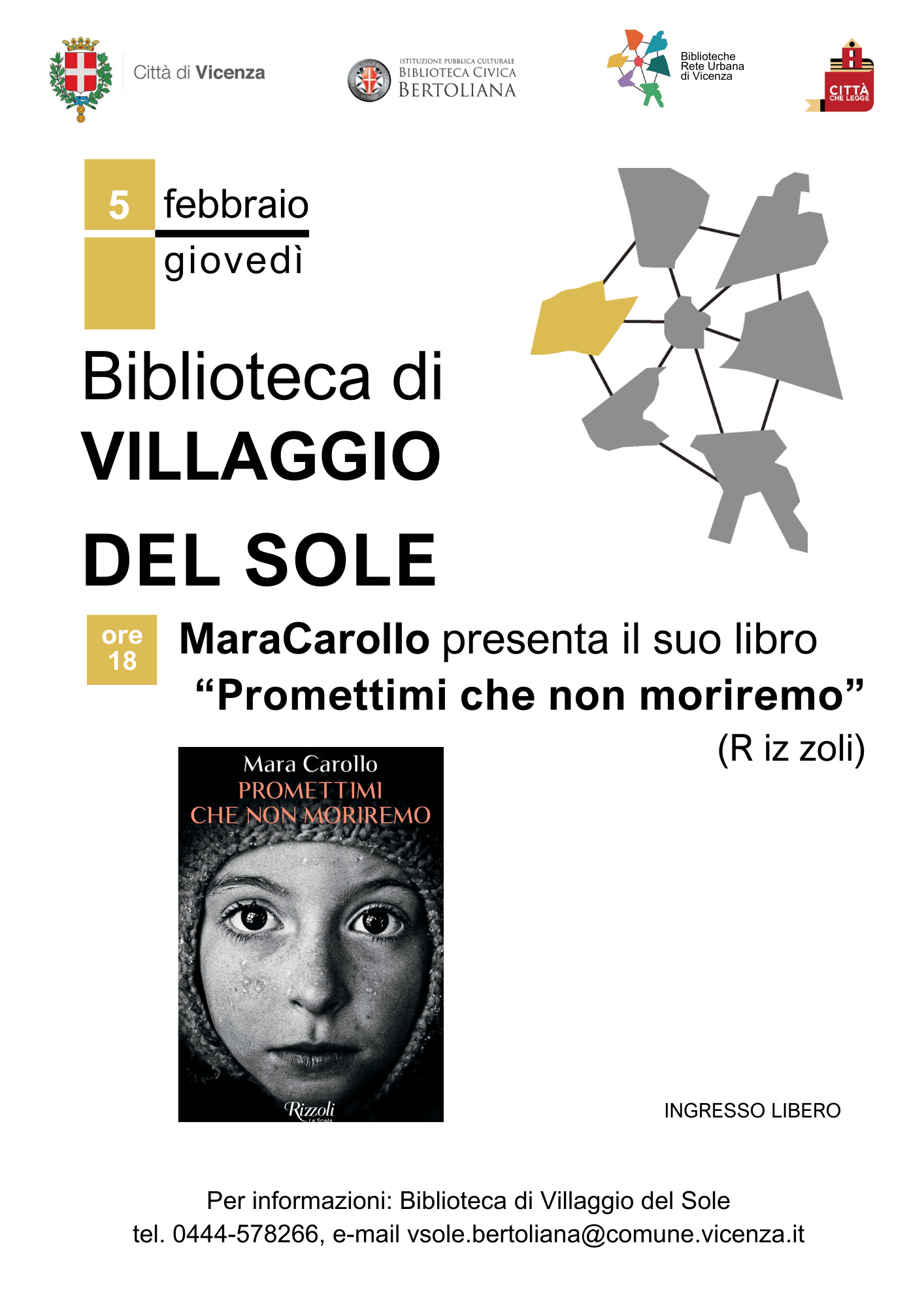 La Biblioteca di Villaggio del Sole ospita la presentazione del libro Promettimi che non moriremo (Rizzoli) di Mara Carollo. L’incontro, a ingresso libero, si terrà alle ore 18 ed è aperto a tutta la cittadinanza.
