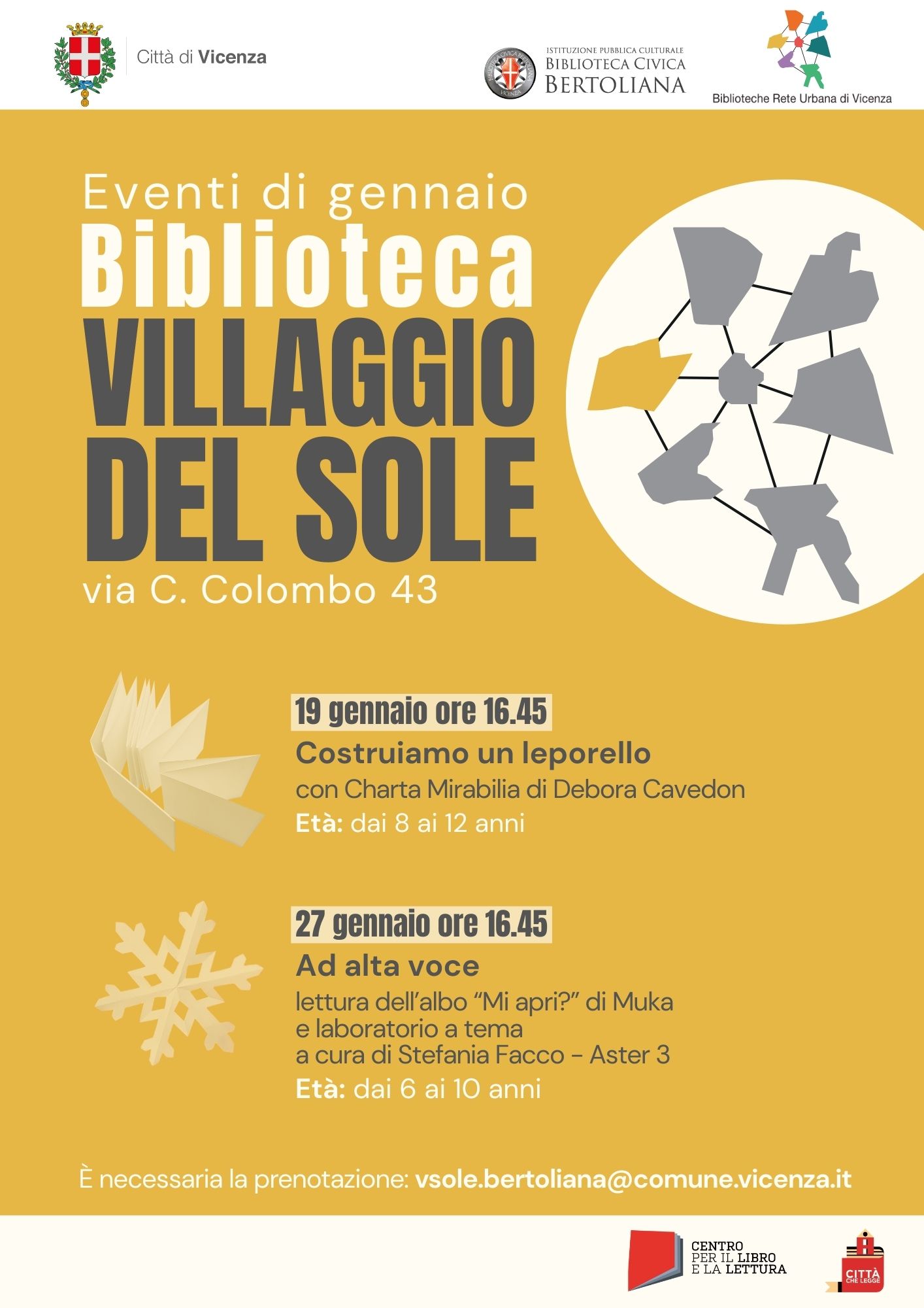 Il 27 gennaio alle ore 16:45, la Biblioteca di Villaggio del Sole ospiterà un pomeriggio dedicato ai bambini dai 6 ai 10 anni. L'evento prevede la lettura ad alta voce dell'albo illustrato "Mi apri?" di Muka, seguita da un laboratorio creativo a tema curato da Stefania Facco (Aster 3). Un'occasione per stimolare l'immaginazione e la manualità dei più piccoli.