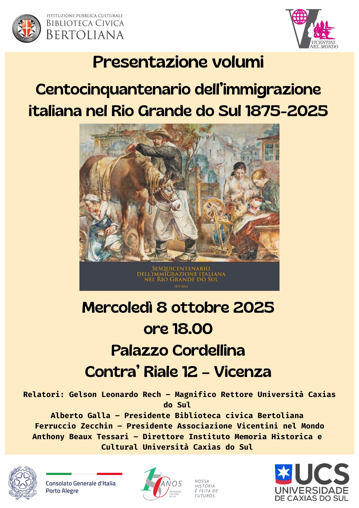 Si svolgerà mercoledì 8 ottobre (ore 18.00) a Palazzo Cordellina la presentazione del libro "Centocinquantenario dell'immigrazione italiana nel Rio Grande do Sul 1875-2025". Nato grazie alla collaborazione di 68 studiosi e di 17 Università brasiliane e italiane, il volume approfondisce gli aspetti più significativi della presenza italiana nello Stato brasiliano del Rio Grande do Sul. A illustrare l'opera interverranno Gelson Leonardo Rech (Magnifico Rettore dell'Univeristà Caxias do Sul), Alberto Galla (Presidente della Biblioteca Civica Bertoliana), Ferruccio Zecchin (Presidente dell'Associazione Vicentini nel Mondo), Anthony Beaux Tessari (Direttore dell'Instituto Memoria Historica e Cultural dell'Università Caxias do Sul).
