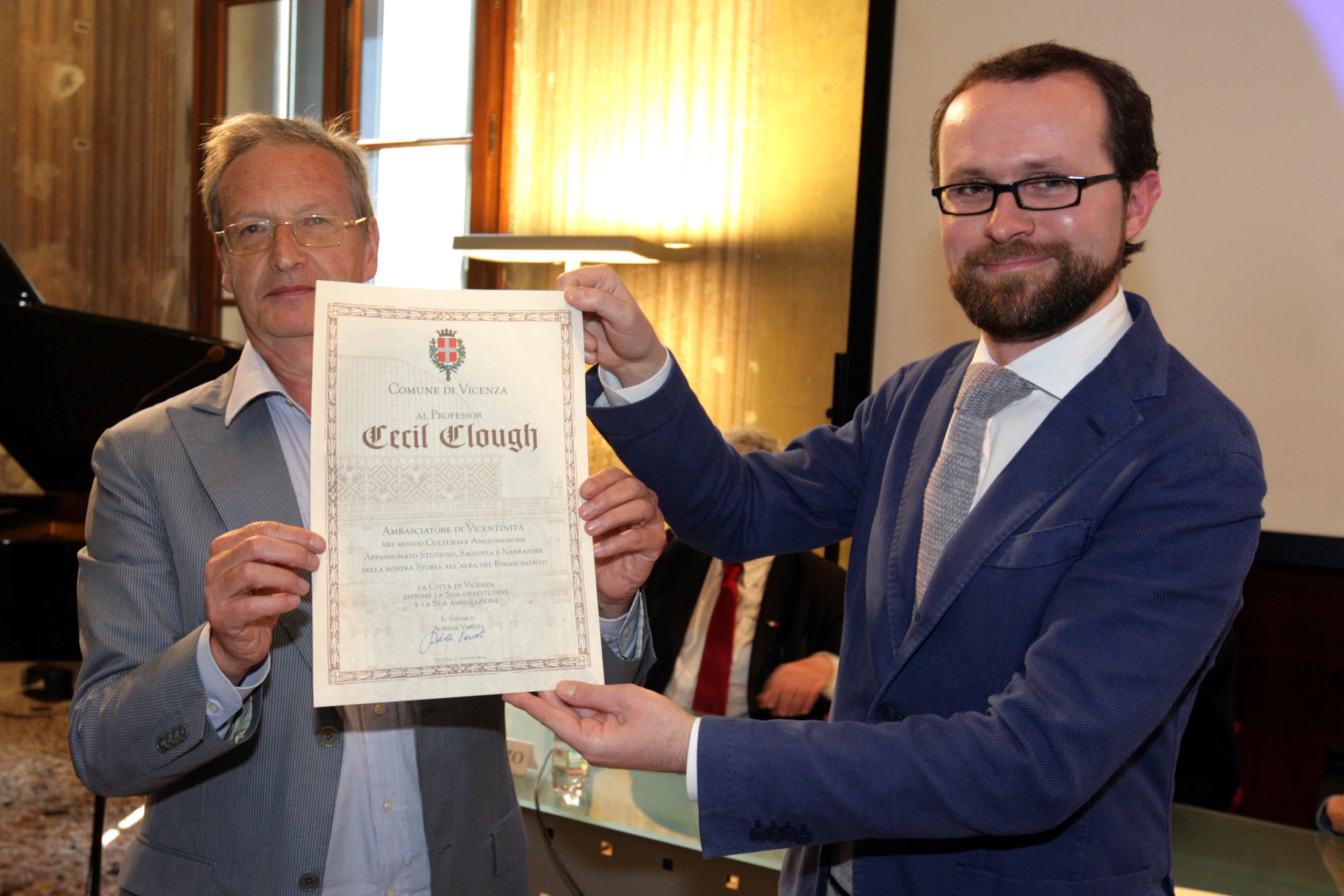 Dopo la consegna del manoscritto da parte di Giacomelli, il vicesindaco ha consegnato al professor Pellizzari, che se ne farà latore nel Regno Unito, un attestato di benemerenza al professor Cecil Clough “ambasciatore di Vicentinità nel mondo culturale anglosassone, appassionato studioso, saggista e narratore della nostra storia all'alba del Rinascimento”.