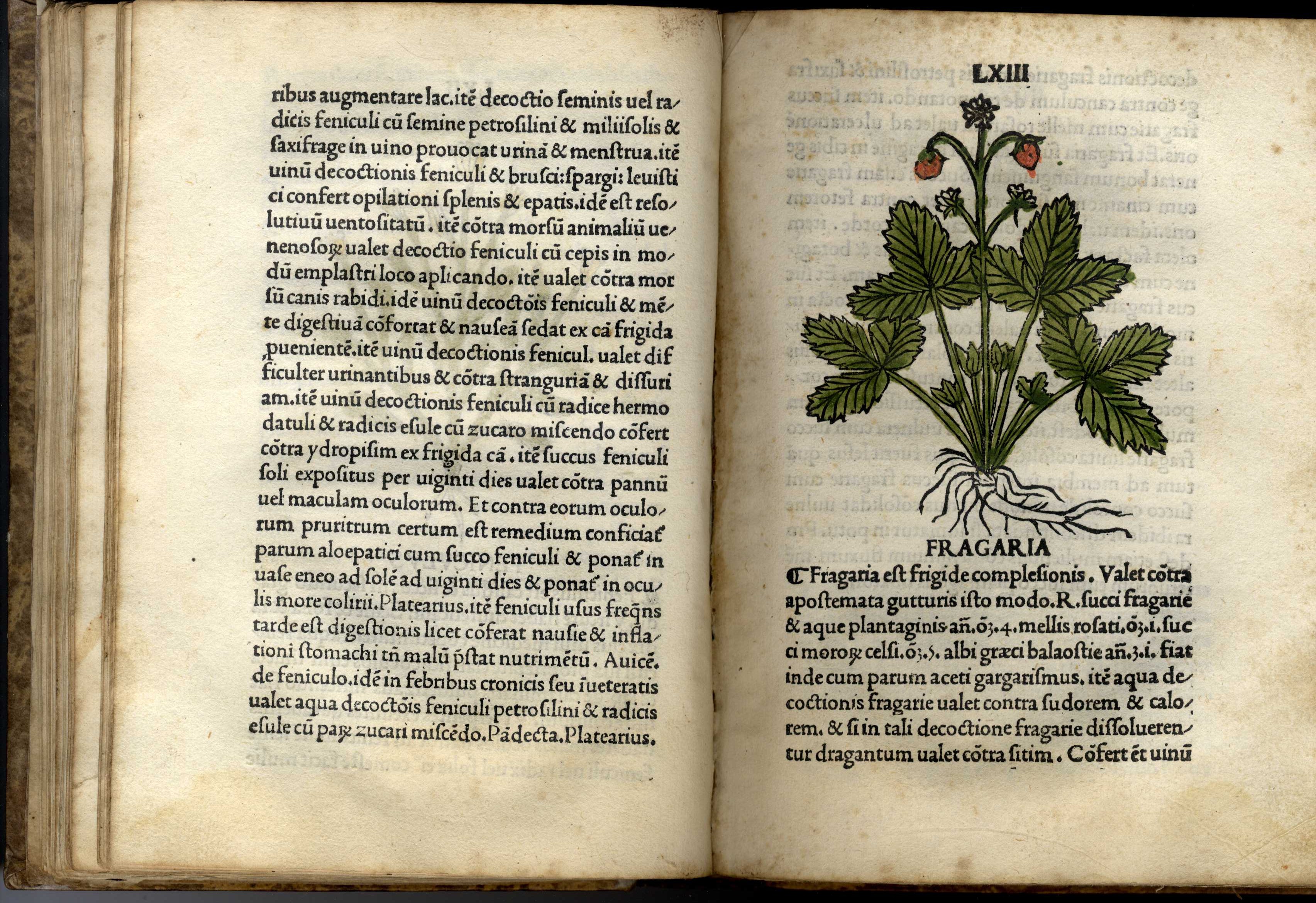 Lo studio della botanica, legata al bisogno di riconoscere le erbe ad azione terapeutica e documentato dalle opere manoscritte di numerosi autori greci e latini (Dioscoride e Plinio il Vecchio in primis), si era ampiamente diffuso dopo l’invenzione della stampa nella metà del ‘400: il primo erbario stampato in Italia fu pubblicato proprio a Vicenza nel 1491. Nel 1499 questo testo venne ristampato a Venezia: l’esemplare posseduto dalla Bertoliana contiene 150 illustrazioni xilografiche di piante acquerellate a mano.