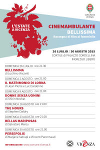 Il ciclo di sei film sull’universo femminile, a ingresso gratuito, ideato e curato da Pier Paolo Giarolo nell’ambito del suo Cinemambulante, proseguirà tutte le domeniche fino al 30 agosto trasformando il cortile di Palazzo Cordellina in una sala cinematografica all’aperto.