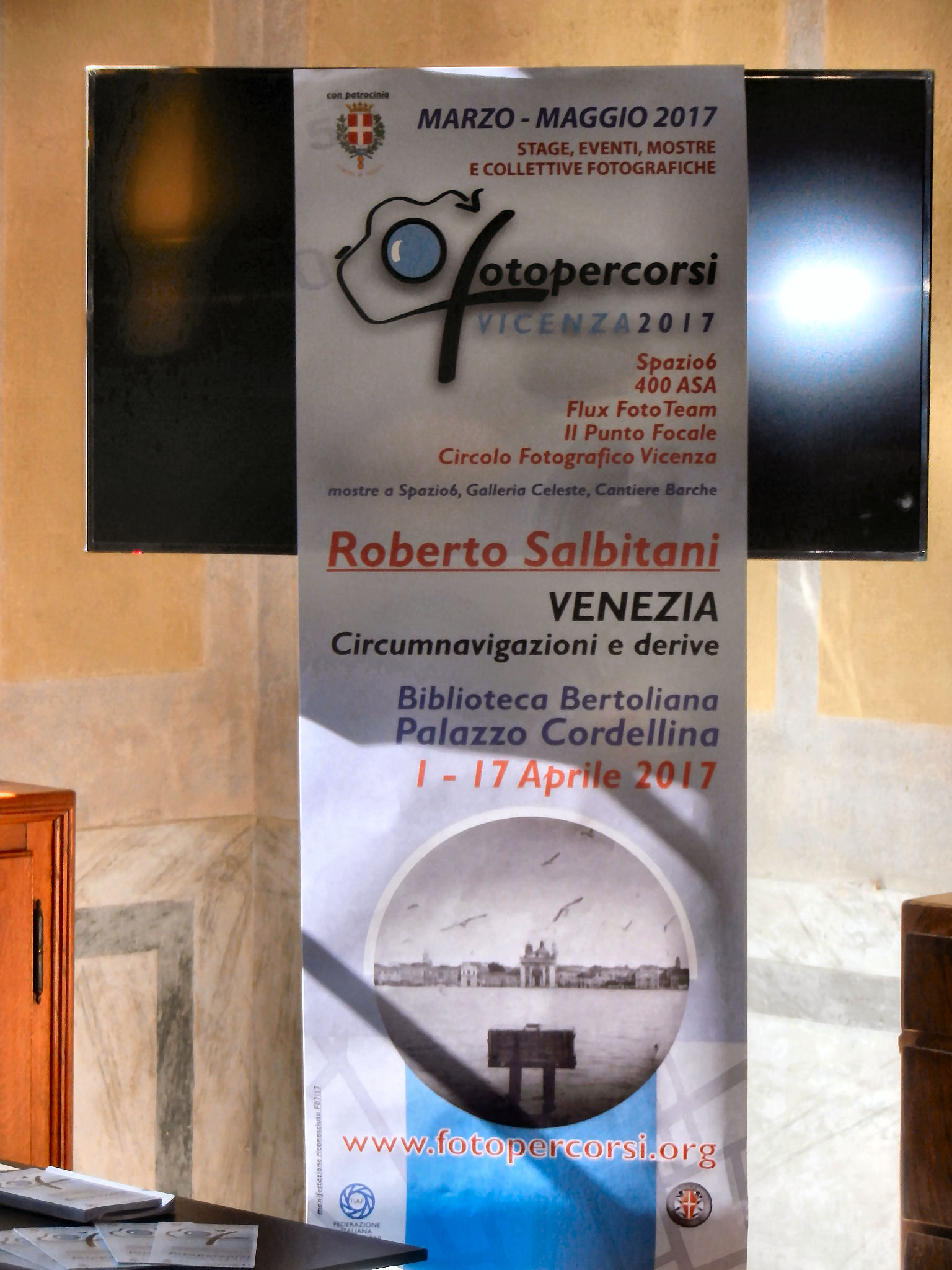 L'evento principale di “Fotopercorsi Vicenza 2017” sarà la mostra “Venezia, circumnavigazioni e derive” di Roberto Salbitani che si terrà dall’1 al 17 aprile a Palazzo Cordellina, sede della Biblioteca Bertoliana, in contra' Riale 12.