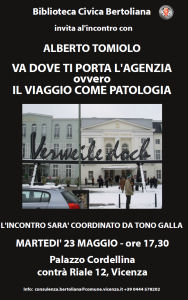 C'è una malattia contemporanea che si contrae nelle agenzie di viaggio: la dromomania, la tendenza nevrotica ossessiva a camminare senza una meta precisa. Il vuoto dell'ansia dell'andare, il viaggio “moderno” che sgretola il tempo e lo spazio si materializza in una sorta di deambulazione insignificante, in un movimento ginnico preordinato. Torna oggi necessario ridare senso al Viaggio, inteso come il muoversi della storia del mondo e della storia personale dell'uomo. Questo il filo conduttore dell'incontro con il poeta veronese Alberto Tomiolo, Va dove ti porta l'agenzia, ovvero il viaggio come patologia, organizzato a Palazzo Cordellina martedì 23 maggio alle 17.30. Insieme all'autore, interverrà il giornalista Tono Galla.