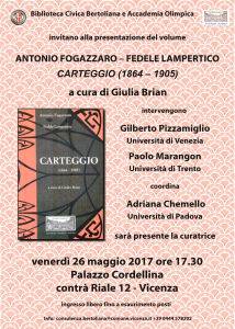 La corrispondenza epistolare tra Antonio Fogazzaro e Fedele Lampertico, due protagonisti della cultura vicentina e italiana, consente di varcare una porta ad accesso diretto sulla società, l’arte, la politica del periodo a cavallo tra i due secoli, rivelando questioni abbandonate sotto la polvere del tempo, aspetti inediti ed interessanti della nostra provincia e non solo. Entrambi osservatori attenti della realtà circostante, posseggono il dono di captare e valorizzare le doti intellettuali di coloro che si trovano sulla loro strada, e nel contempo sono dotati della capacità di intessere relazioni, intrecciare fili e contatti, stimolare incontri, dare forma ad iniziative culturali, assistenziali, filantropiche. Le lettere infatti offrono uno spaccato sulla società civile e letteraria vicentina e italiana, illustrano la ragnatela di relazioni culturali e politiche dei due corrispondenti, fanno luce su cronache locali inedite, danno vere e proprie lezioni di pratica politica. L’incontro proporrà un itinerario attraverso alcune di queste lettere alla scoperta di persone, fatti e questioni come i diritti delle donne nella Vicenza di fine Ottocento, la vita in Parlamento dei due corrispondenti, la salute del romanzo italiano, ma anche le memorie familiari di due illustri famiglie vicentine.
