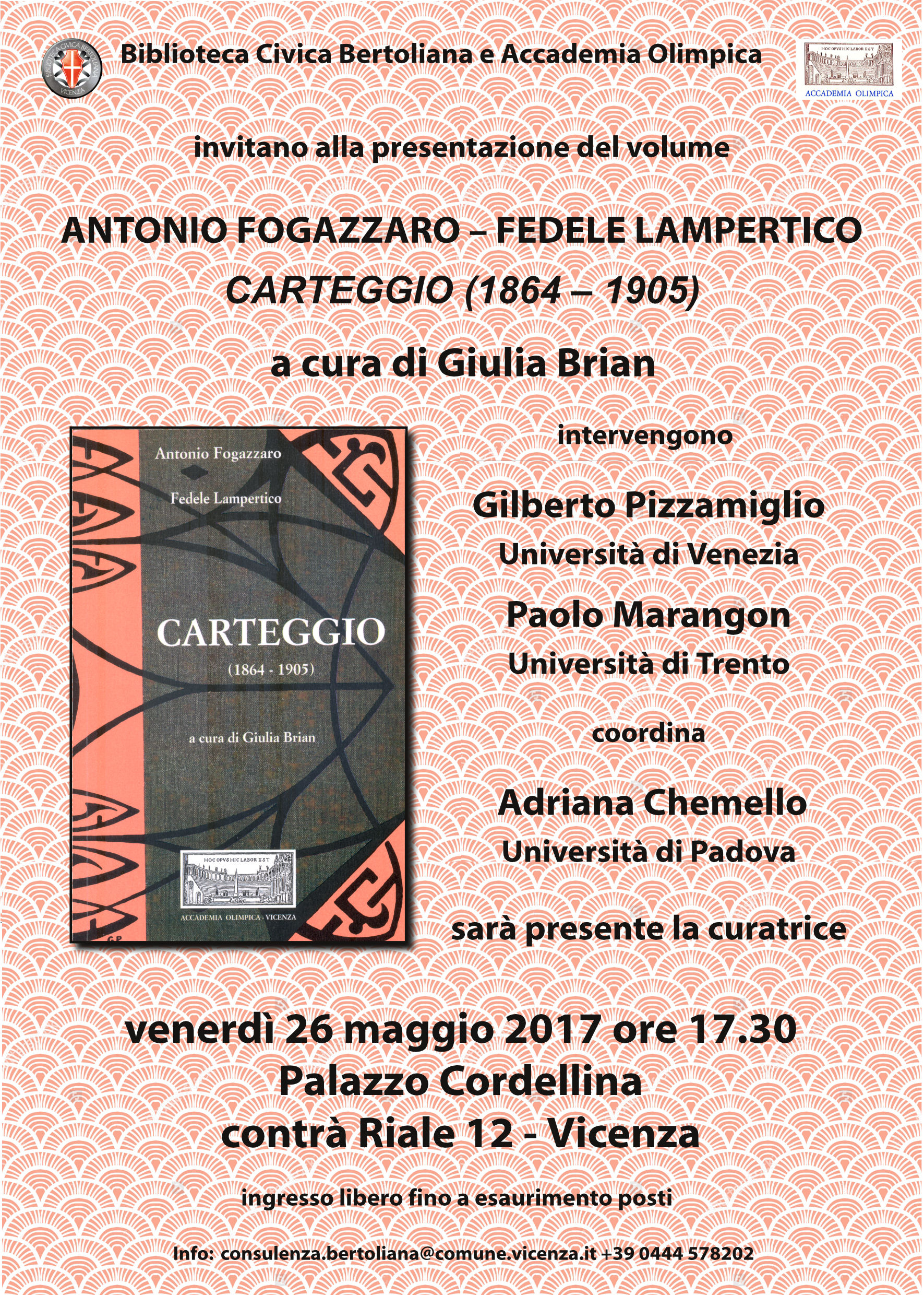 La corrispondenza epistolare intercorsa tra Antonio Fogazzaro e Fedele Lampertico (1864-1905), è stata ricomposta e contestualizzata dal paziente e tenace lavoro di ricerca di Giulia Brian; il volume del Carteggio (1864-1905), realizzato sui materiali del fondo Lampertico conservati in Biblioteca Bertoliana e pubblicato dall'Accademia Olimpica, verrà presentato a Palazzo Cordellina venerdì 23 maggio alle 17.30. Insieme all'autrice interverranno Gilberto Pizzamiglio (Universita' di Venezia) e Paolo Marangon (Universita' di Trento). Coordina l'incontro Adriana Chemello (Universita' di Padova).