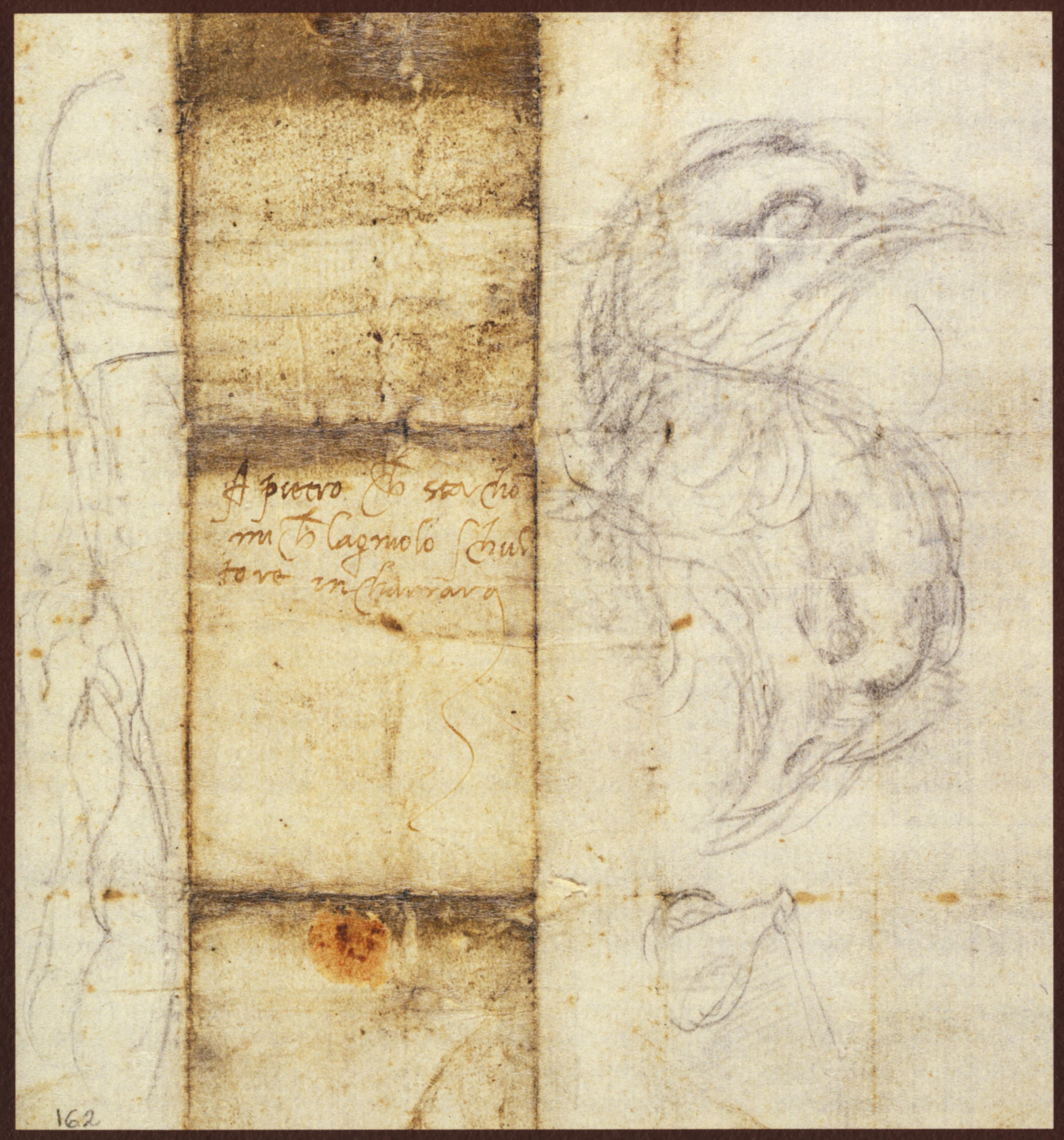Ai lati del foglio usato da Michelangelo per vergare il breve messaggio si stagliano gli schizzi a lapis del capo e del petto di un uccello rapace, nonché di una gamba umana. Sul verso è disegnata la zampa tesa e scarnificata di un uccello posta subito sotto la firma Michelagnolo in Firenze. I tre disegni sono del Buonarroti, mentre gli altri schizzi sommari e deboli sono di una mano che emula l'impronta grafica michelangiolesca.
