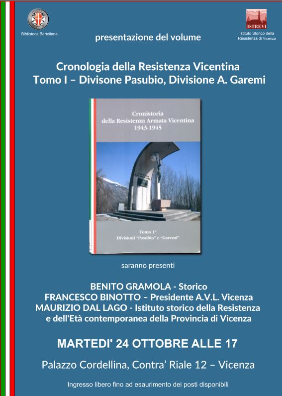 Istrevi e Biblioteca Bertoliana organizzano martedì 24 ottobre alle 17 a Palazzo Cordellina la presentazione dell'undicesimo quaderno della Collana dei Quaderni della Resistenza vicentina, Cronistoria della Resistenza Armata Vicentina, 1943-1945, curato da Benito Gramola ed edito dall'Associazione Volontari della Libertà della provincia di Vicenza.