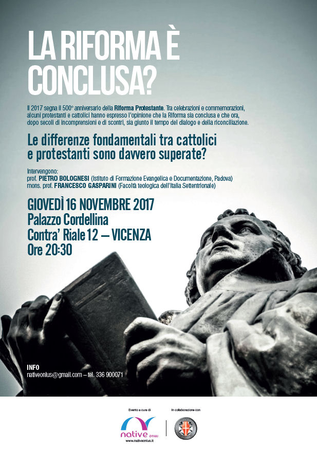 Si terrà giovedì 16 novembre, alle 20.30, a Palazzo Cordellina, in contrà Riale 12, la conferenza dal titolo“La Riforma è conclusa?” proposta dall'associazione Native Onlus in collaborazione con la Biblioteca Bertoliana.