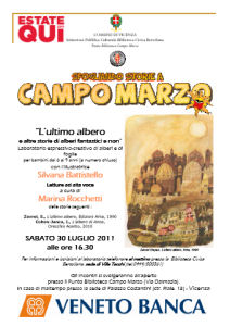 Il secondo appuntamento, dedicato ai bambini, dell'iniziativa "Sfogliando storie a Campo Marzo", promossa dalla Biblioteca Civica Bertoliana in collaborazione con il Comune di Vicenza e con il contributo di Veneto Banca, si terrà sabato 30 luglio alle 16.30 presso il Punto Biblioteca Campo Marzo. In occasione dell'Anno Internazionale delle Foreste viene proposto un laboratorio d'illustrazione in cui si sperimenteranno le varie forme e i diversi colori degli alberi che nasceranno dalla fantasia dei bambini. L'attività ludico-pittorica, intitolata "L'ultimo albero e altri alberi fantastici e non", è tenuta dall’illustratrice vicentina Silvana Battistello che ha frequentato i corsi d’illustrazione della Scuola Internazionale di Sarmede ed ha al suo attivo vari laboratori artistici per l’infanzia. La Battistello ha condotto con successo l'attività "Cappuccetto Rosso tra gli alberi" nella scorsa edizione di "Sfogliando storie a Campo Marzo".